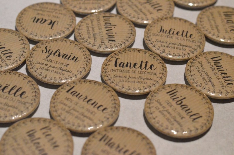 Dessinés et fabriqués dans notre atelier, les badges personnalisés apporteront une petite touche de déco à votre mariage.